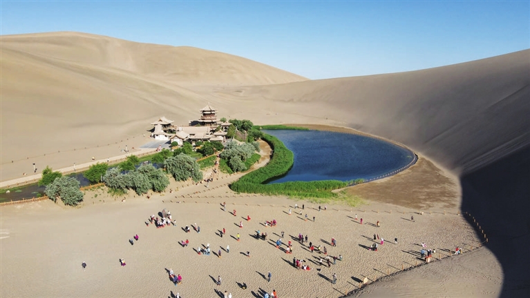 眼下正值甘肃省敦煌市旅游旺季,世界文化遗产莫高窟和沙漠奇观鸣沙山月牙泉景区等地持续吸引游客前来参观游览。截至6月7日,敦煌市今年累计接待游客超135.5万人次。