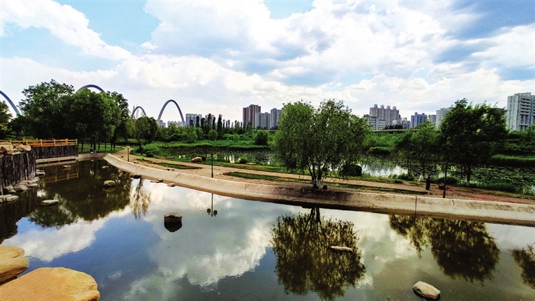 仲夏季节,进入汾河湿地,树木茂盛,百草葱茏,蓝天白云,空气清新,汾水长流,风景如画。