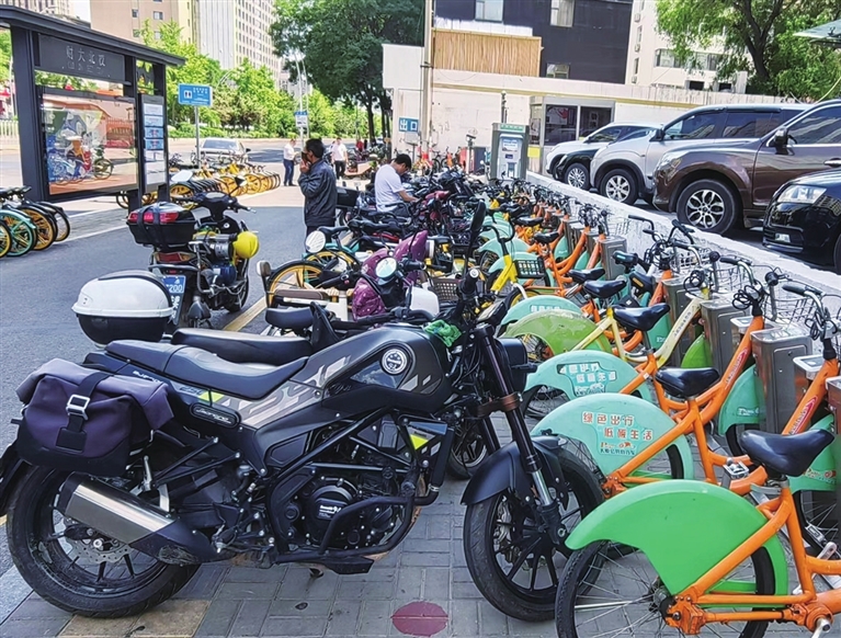 6月12日,记者在平阳路与南内环街交叉口西南角的公共自行车租赁点看到,乱停乱放的非机动车和摩托车将租赁点的公共自行车“包围”,导致无法正常租还车辆,希望相关部门加强管理,避免此类情况发生。