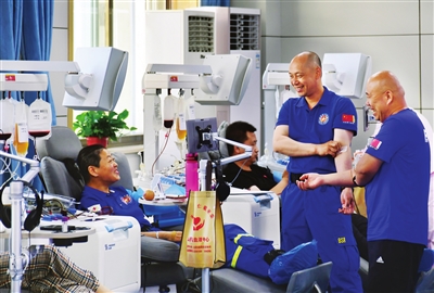 6月14日是第二十个“世界献血者日”。当日,市血液中心机采大厅内,蓝天救援队队员前来无偿献血。 赵世凯 田蔚然 摄