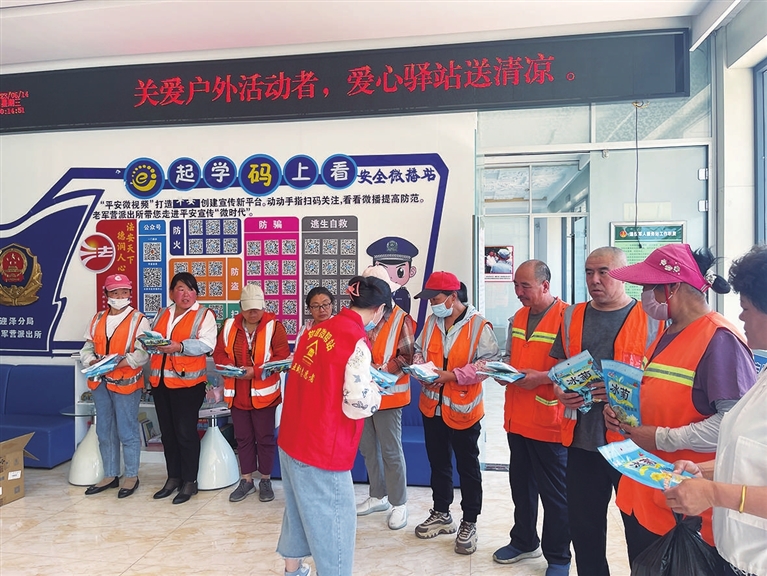 连日来,我市持续高温天气。为关怀一线作业人员的身心健康和劳动安全,6月16日上午,老军营街道新南二社区联合爱心驿站开展为期一周的“关爱户外劳动者 爱心驿站送清凉”活动。向高温作业中的环卫工人以及快递小哥送去解暑清凉的菊花茶、藿香正气水等防暑用品。刚领到藿香正气水的京东快递员笑着说:“早上刚刚出现中暑症状,我正准备去买藿香正气水呢!没想到社区就给发了,真是太及时了!” 侯慧琴 杨然 摄