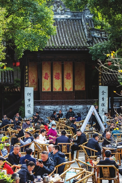 位于成都铁像寺水街的陈锦茶铺前坐满了晒太阳喝茶休闲的人。