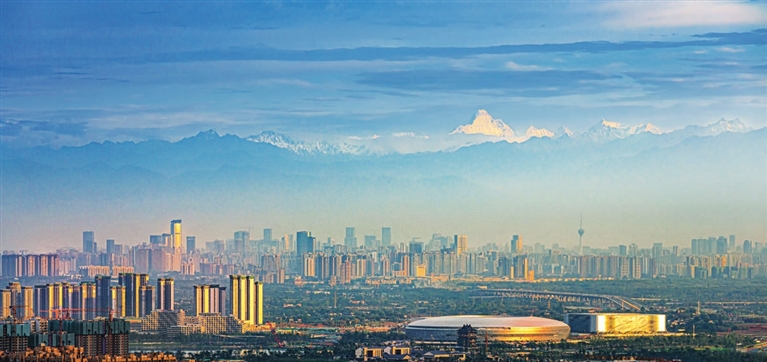 这是成都市区建筑物以及远处清晰可见的雪山。