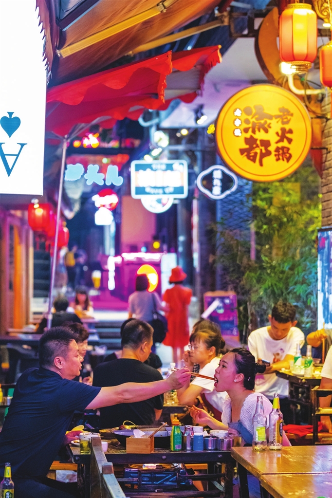 食客在成都猛追湾街道望平社区的美食一条街“香香巷”中吃火锅。