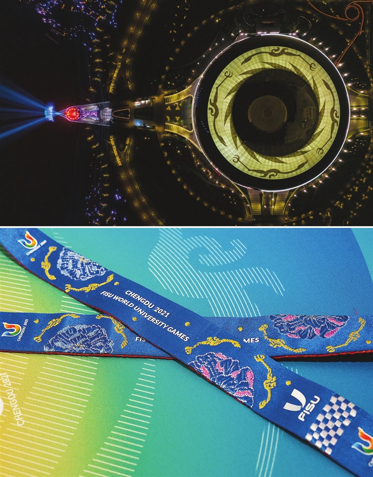 上图为第31届世界大学生夏季运动会开幕式主体育场及主火炬,主体育场的穹顶是由12000多块彩釉玻璃拼接而成的“太阳神鸟”;下图为绣有神鸟图案的大运会奖牌绶带。