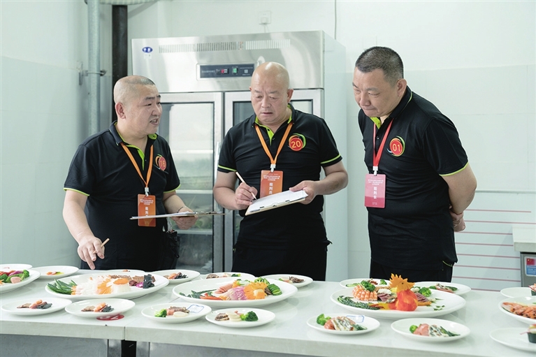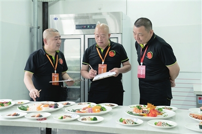 烹饪(中餐)比赛包括三个项目,冷拼、热菜和面食制作。参赛选手需任意选取9种食材制作雄鸡造型的冷拼,还要烹制一条黄河鲤鱼,再做一盘莜面蒸饺。中餐裁判长唐晓龙介绍,有44位选手参加烹饪(中餐)比赛,裁判会严格按照国家标准对选手从食材选用、制作流程以及成品的色、香、味等方面进行评比。