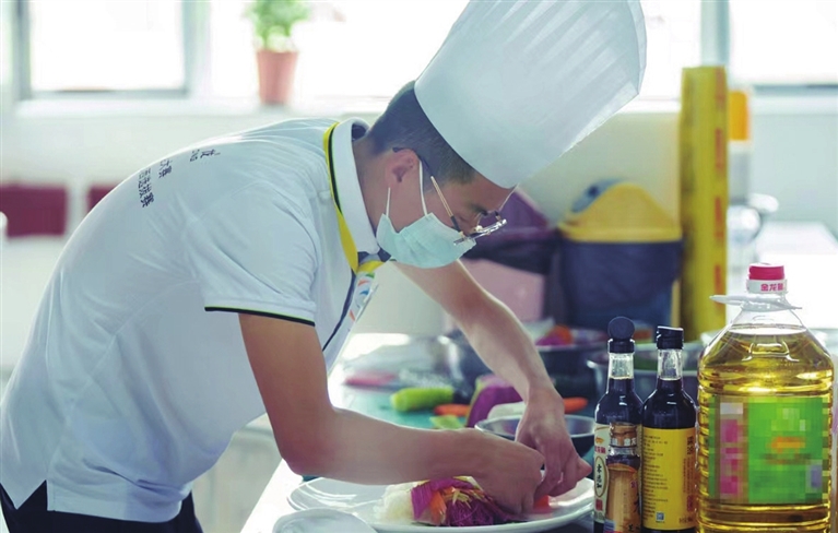 烹饪(中式)比赛现场,来自晋能控股装备制造集团高级技工学校的高振杰手拿刻刀,将水萝卜刻成雄鸡的鸡冠,将一根根豆角刻成尾羽。他说:“冷拼的题目是雄鸡造型,如果只是简单地弄成一个大公鸡造型,很难在众多‘高手’中脱颖而出,必须要创新。”