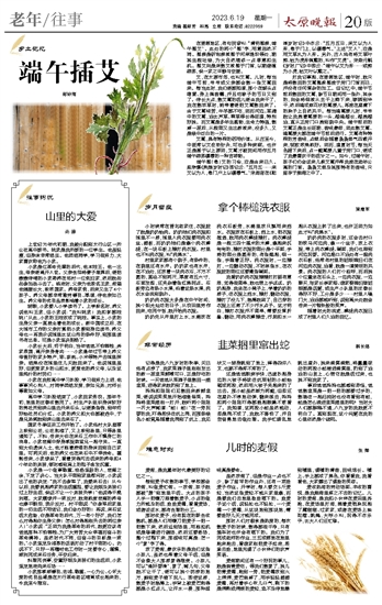 打我记事起,在晋源地区,端午时,就只是将割回的艾蒿整株插挂于房门门首而已,并没有任何复杂的加工。但记忆中,端午节前后割回的艾蒿,除节日期间用一些外,其余的,则会将细枝从主干上擗下来,晾晒到半干,然后编成麻花状的蒿腰儿,再挂在屋檐下的垛子上自然风干。每当编蒿腰儿时,爷爷就让我拽着蒿腰的一头,越编越长,越拽越远,直从正房门口拽到院中央。端午前后的艾蒿正是生长旺期,香味最浓,因此割艾蒿、编蒿腰大都在端午节前后进行。艾蒿有种特殊的芳香味,点燃后会随着袅袅烟气四散开来,驱蚊效果极好。因而,盛夏时节,每当天色暗下来后,点一截蒿腰儿置于房门口,便成了我最喜欢干的活计之一。如今,过端午时,孩子们仍会送来几株艾蒿并帮我挂在老年公寓的门首。袅袅艾烟及其那特有的香味,只留存于脑海之中了。