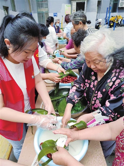 6月18日,宁化府社区新时代文明实践站“迎端午节包邻里粽”活动现场,社区工作人员和居民围拢在一起,用灵巧双手把对生活的热爱包进甜甜的粽子里。这次活动拉近了邻里关系,营造出浓浓的节日氛围。 郭晓华 申智红 摄
