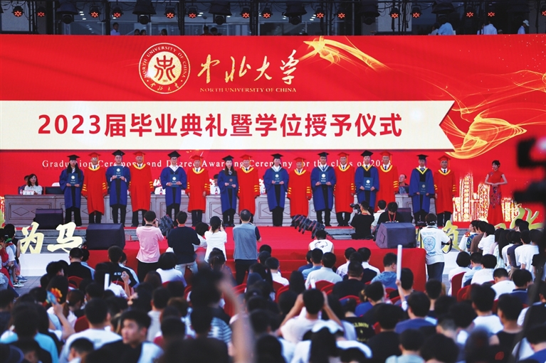 6月19日,中北大学举行2023届毕业典礼暨学位授予仪式。该校师生精心编排的《顶碗舞》《华风雅韵》《如愿》等文艺节目,以现场+线上直播的形式,向毕业生送上一份别样的毕业礼物。