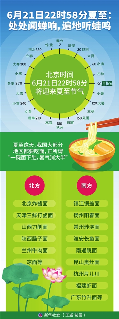 中国民间文艺家协会会员、中国民俗学会理事袁瑾介绍,以夏至为起点,气温持续升高,一年最热的时段即将到来。民间有“夏至不过不热”之说。按照民间习俗,夏至这天,我国大部分地区都要吃面,正所谓“一碗面下肚,暑气消大半”。