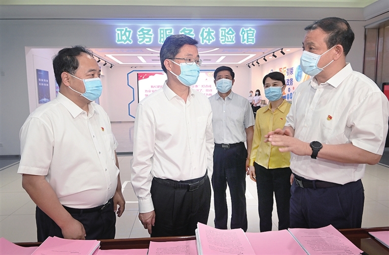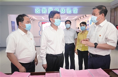 主题教育开展以来,在中央第三指导组有力指导下,省委一体学习领会习近平总书记系列重要讲话重要指示批示精神和考察调研山西重要讲话重要指示精神,牢牢把握“学思想、强党性、重实践、建新功”总要求,扎实有序推进理论学习、调查研究、推动发展、检视整改等各项工作,努力推动全省主题教育实现良好开局,持续走深走实,取得阶段性成果。第一批单位开展情况如何,特别是省级窗口单位如何将主题教育同改进作风、服务群众更好地结合起来,带着这些思考,蓝佛安来到省行政审批服务管理局,实地督导检查主题教育推进情况。在政务服务大厅,蓝佛安认真听取汇报、查阅资料,详细了解省行政审批服务管理局的经验做法和问题不足,并提出改进意见。他指出,行政审批服务部门主题教育开展成效如何,直接关系经营主体和人民群众的满意度、获得感,直接关系我省营商环境建设成效。越是使命光荣、任务艰巨、责任重大,越要高标准高质量推进主题教育。要进一步抓好学习对照和检视整改,从群众最满意的地方做起,从群众最不满意的地方改起,持续转变工作作风、提高服务效能,让经营主体和人民群众办事更加便捷高效舒心。蓝佛安还详细了解省行政审批服务管理局结合开展主题教育,推动“7×24小时”政务服务全覆盖工作进展,详细询问涉企政策兑现情况,对“一站式”综合服务平台建设成效表示肯定。他强调,要聚焦主题教育和中心工作两手抓、两促进,进一步打通办事堵点,消除服务盲区,持续抓好服务平台建设,在更多领域推出集成办事场景,确保国家及我省惠企政策落地落实。在自然资源领域事项审批窗口,蓝佛安察看省市县三级“全业务全流程网办”运行情况,强调要发挥好信息技术手段作用,着力推进审批服务法治化、规范化、透明化,让公共资源交易在阳光下运行。在高校毕业生服务窗口,蓝佛安与正在咨询人事档案管理政策的大学生面对面交流,强调要加强对各类便民政策的宣传解读,让广大群众早知晓、早受益。