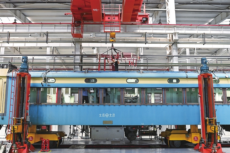 太原机务段太北检修车间承担着石太、北同蒲等铁路229台货运机车的检修任务,天车司机所在的动力组需要辅助各部门完成火车头零件的吊运、拆装等一系列环节。在车间最忙的时候,王孟媛和队员们几乎不敢喝水,中途上卫生间就有可能耽误进度。
