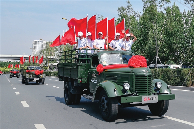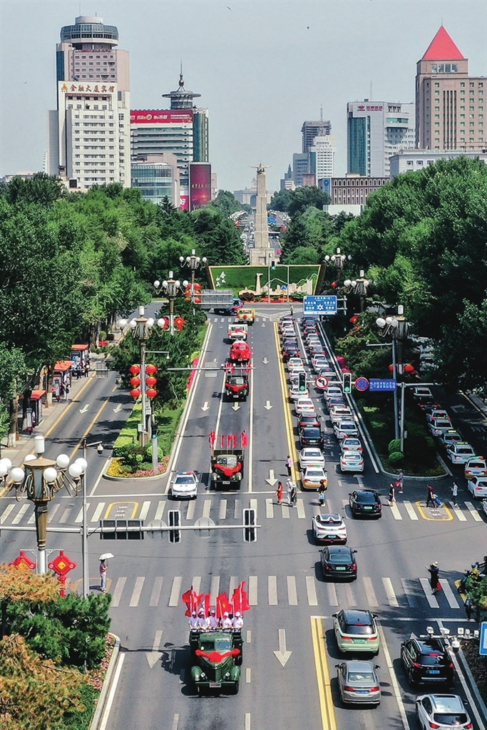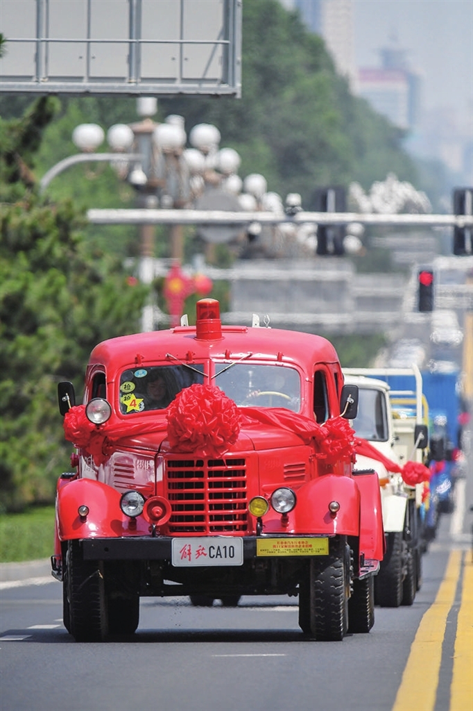 6月26日,解放卡车巡游车队行驶在长春市人民大街上。