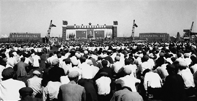 1953年7月15日,中国第一座汽车厂——第一汽车制造厂在吉林省长春市奠基,新中国汽车工业开始起步。这是一汽奠基典礼大会会场(资料照片)。