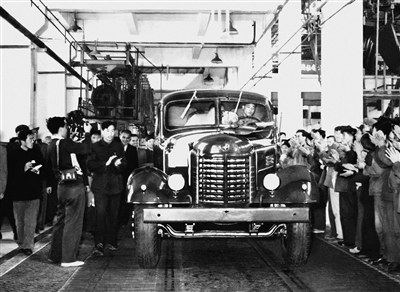 1956年7月13日,第一辆解放牌汽车驶下装配线(资料照片)。