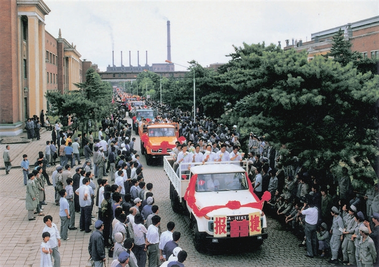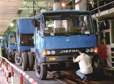 1986年7月15日,随着热烈的掌声、鞭炮声和唢呐声,一辆辆各种颜色的崭新的CA-141型解放车陆续下线(资料照片)。