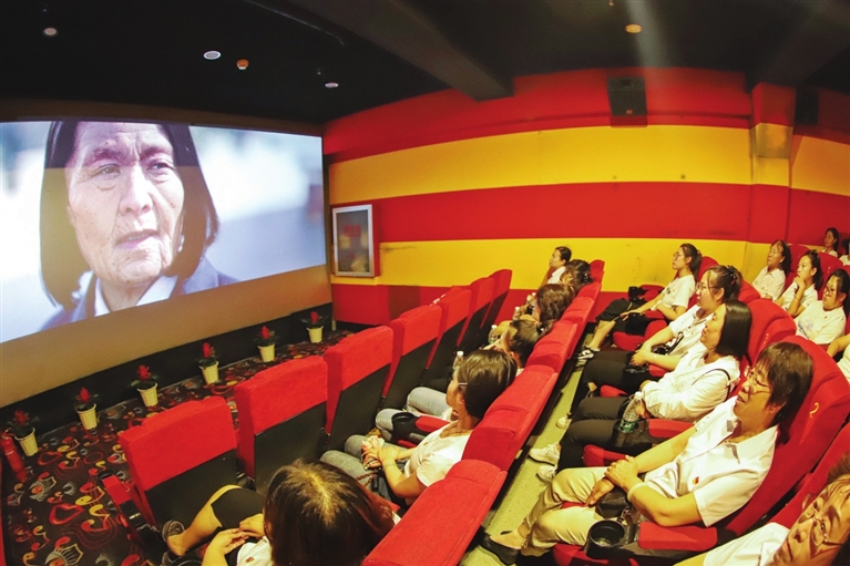 学习英模事迹,庆祝党的生日。随着电影《申纪兰》公映,我市各大影院迎来众多党员观影。图为6月29日,尖草坪区上兰街道的党员干部走进山西剧院观看电影《申纪兰》。