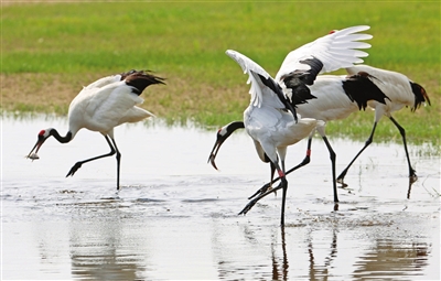 夏日,位于黑龙江省西部的黑龙江扎龙国家级自然保护区郁郁葱葱,丹顶鹤悠闲觅食,自在飞翔,呈现出一派生机勃勃的生态美景。