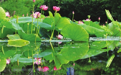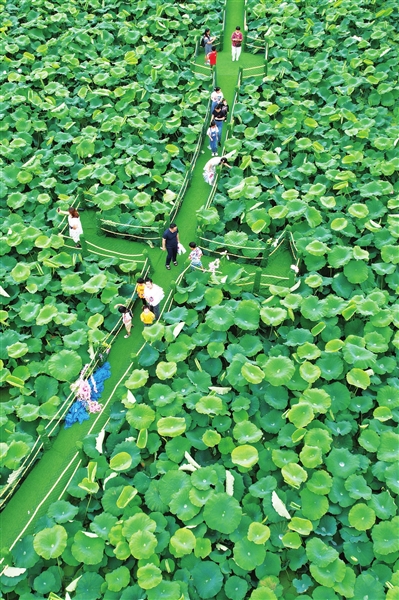 6月23日,在湖南省湘西土家族苗族自治州吉首市,游人在乾州古城胡家塘赏荷休闲。