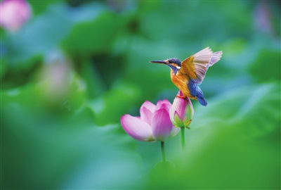 6月16日,在四川省绵阳市游仙区富乐山公园,一只翠鸟站在荷花上。