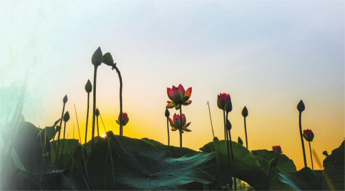 6月16日在山东省潍坊市坊子区太保庄街道前铺村拍摄的晨光中的荷花。