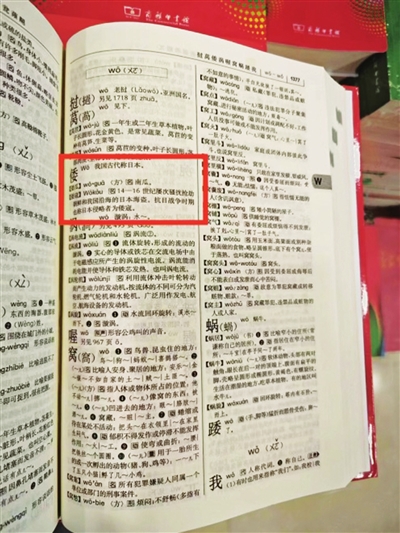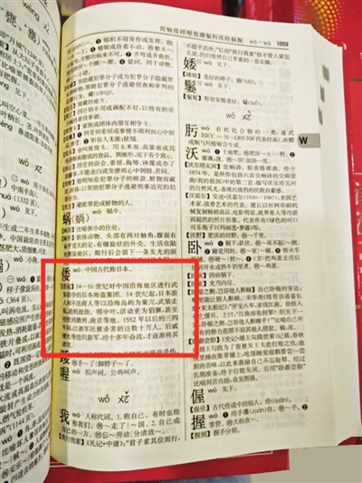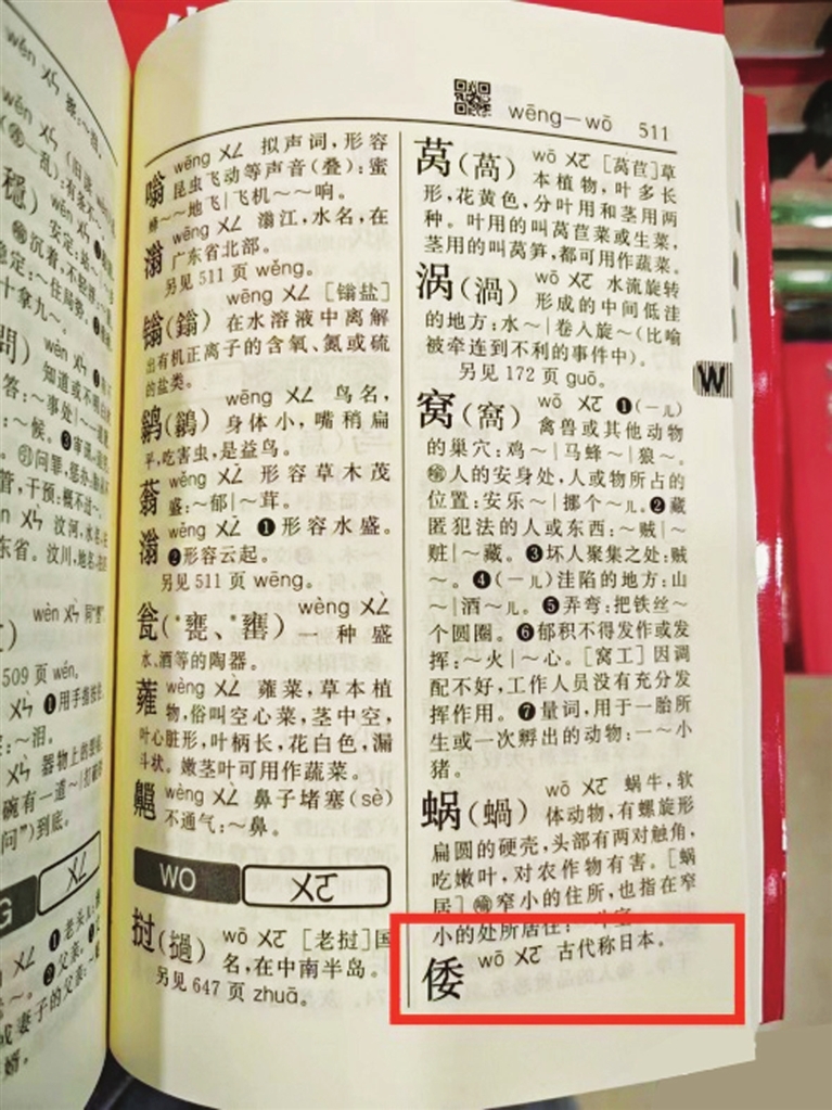 记者注意到,字典词典区域摆放在门口正中显眼位置,涉及汉语字典、中英词典等种类繁多。目前书店售卖商务印书馆出版的《新华字典》为第12版,《新华词典》为第4版,《现代汉语词典》为第7版。经调查,第12版《新华字典》中提到的“倭”字并未组词,而第4版《新华词典》和第7版《现代汉语词典》都有收录“倭寇”一词。