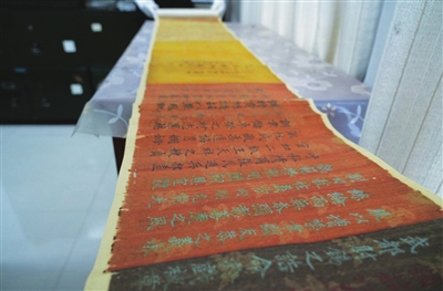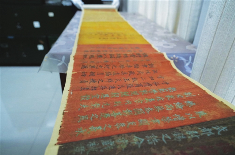 据了解,该圣旨长2.22米、宽0.3米,通体采用五种颜色的绢帛制成,用汉、满两种文字竖书,右侧为楷体汉文,共14行143个汉字,左侧为对照书写的满文,共23行。