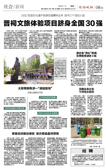 自2018年以来,“晋心远扬——晋祠文化遗产传承及旅游体验综合项目”坚持深入挖掘晋祠历史文化遗产中蕴含的文化精髓和时代价值,创新文物合理利用方式,先后开发了实景演出、文化节事、沉浸体验、数字展示、主题展览、研学互动、文创研发等7大类文化体验项目,在景区常态化展示和演出,以专业性、综合性为特色,开展进校园、进军营等形式多样的活动,逐步完成了从静到动、从传统观光到体验游憩的系列转变,为推动我市文物事业高质量发展作出了贡献。