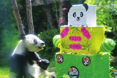 在庆祝活动上,“欣欣”收到装满苹果的墨西哥传统玩具“皮纳塔”作为礼物。许多游客驻足、合影,品尝活动方准备的熊猫图案蛋糕。一些当地儿童戴着熊猫图案帽子,用剪纸剪出熊猫图案,共同为“欣欣”庆生。