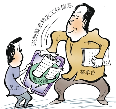 前不久,重庆市高级人民法院公布了一则“职工不转发朋友圈被罚1万元并开除”案例,引发广泛关注。微信和朋友圈本是个人的社交场所,一些单位为了营销和扩大宣传,而强行征用员工朋友圈的做法,让人心生反感。 (《工人日报》7月3日)