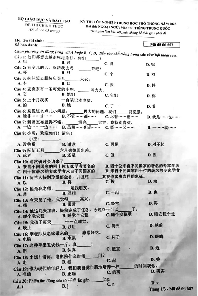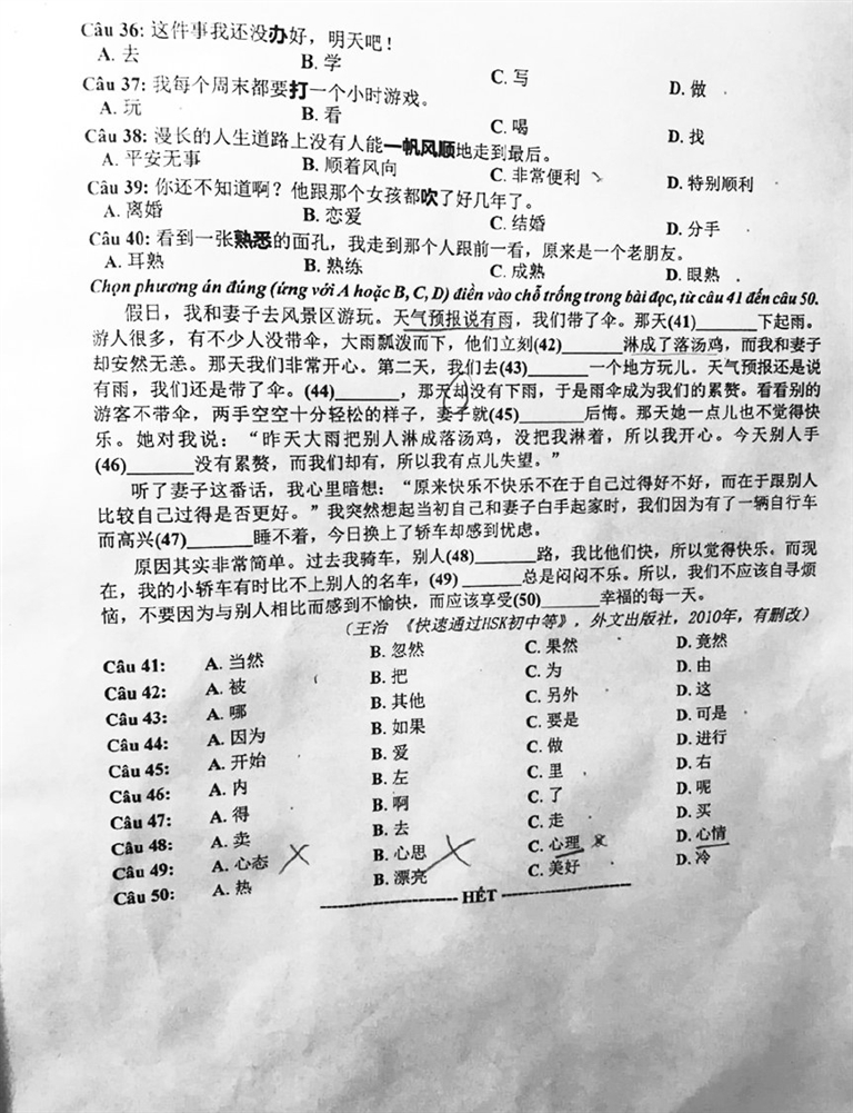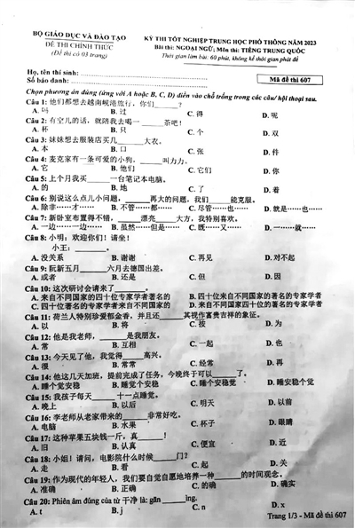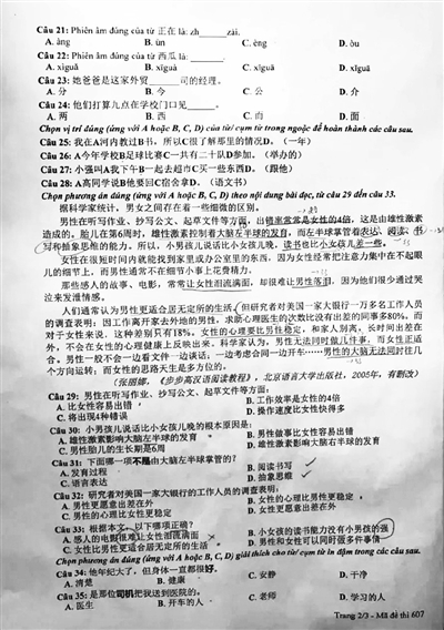 其实这是越南大学招生的外语水平测试试卷,这种外语水平测试除了汉语,还有其他对越南而言是外语的语种,合格者会增加录取概率,但并非中小学必修课或“越南高考”的主要测试课目。