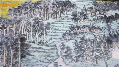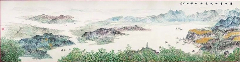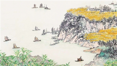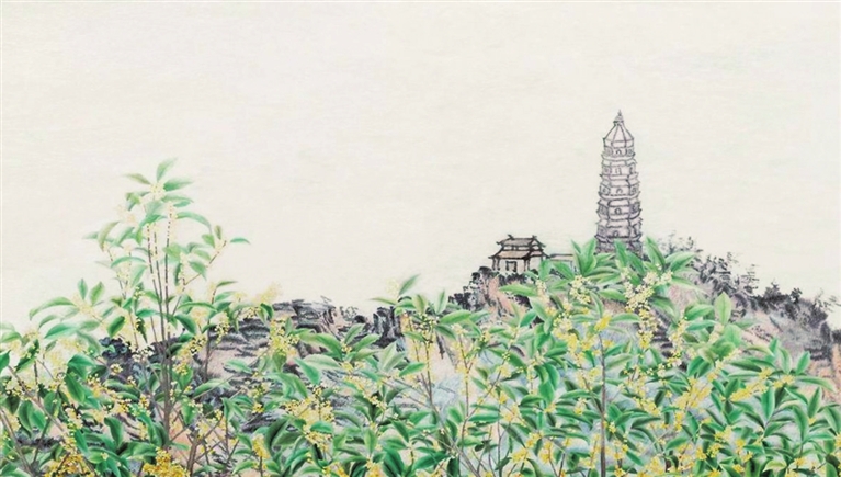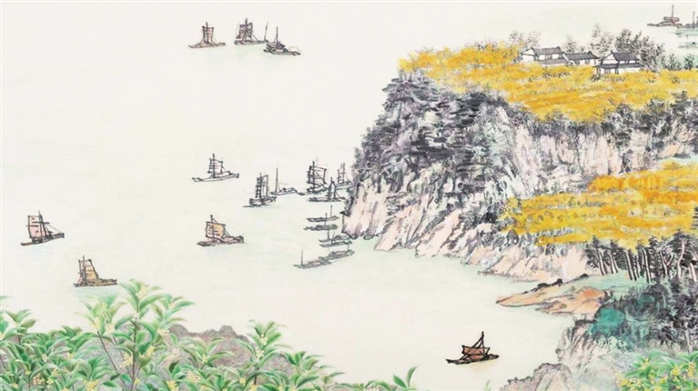 为艺术展现长三角地区贯彻落实习近平总书记“绿水青山就是金山银山”生动实践,邹英姿在原画创意时,把近景苏州市花丹桂、金桂、银桂与长江三角洲山水组合起来。