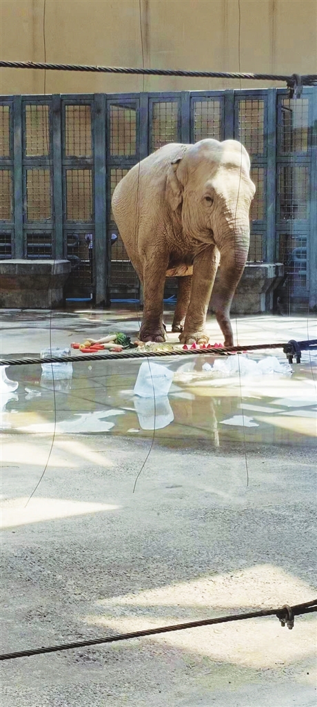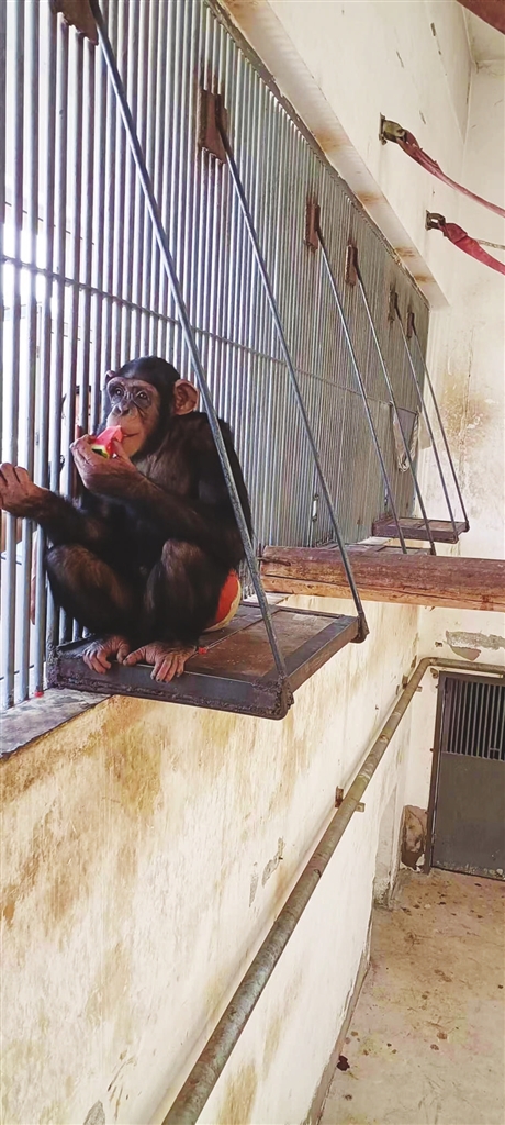 在大象馆,亚洲象“豆豆”的馆舍里放着五六个冰块,每个都有水桶大小,冰块上面、四周还放着豆豆的早餐,西瓜、苹果、萝卜、青草等。豆豆显然对这些冰镇果蔬很有胃口,“稀里哗啦”一顿大嚼,几盆食物眼瞅着见底了。在黑猩猩馆,今年“六一”刚与游客见面的四只小黑猩猩——团团、圆圆、可可、乐乐不停的上蹿下跳,看见游客在拍照、摄影,就会凑过来跟人们挤眉弄眼、“搔首弄姿”,很有镜头感。这时,饲养员打开馆舍门来发放清凉消暑食物,它们立刻就顾不得了,纷纷上前去抢西瓜、火龙果,靠着冰块蹭痒、凉快,一副“顽童”模样。