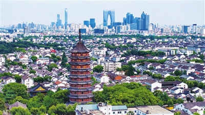 城门排列、街巷纵横、水道交错,历经岁月沧桑,如今的姑苏古城与《平江图》里的整体布局基本一致。一头是古城最高点,始建于南朝梁时的北寺塔,另一头是苏州工业园区拔地而起的摩天大楼,二者穿越时空、遥相呼应。
