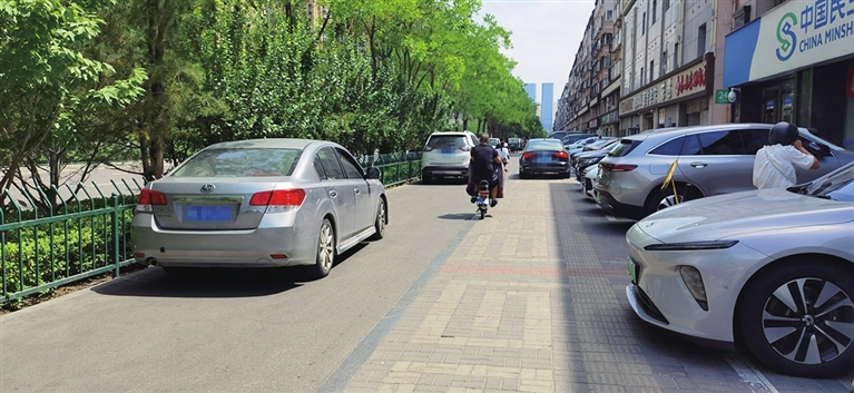 这是记者在文兴路漪汾街口以北拍到的图片,路西的商户门前停车位紧张,一些人直接将车停在非机动道上,影响骑车人通行,还存在交通安全隐患。