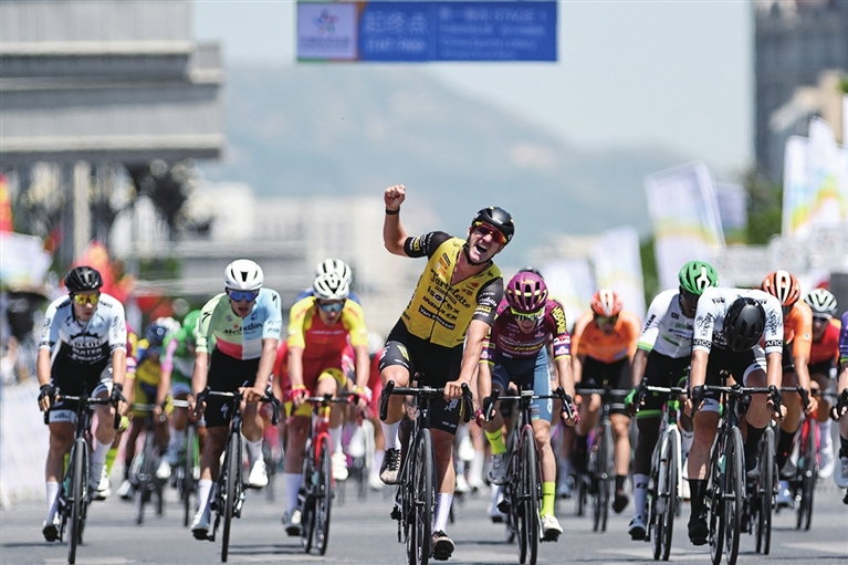7月9日,比利时塔特雷托-艾索雷斯车队选手蒂莫蒂·杜邦(中)在冲刺过线后庆祝,他以2小时15分10秒的成绩赢得赛段冠军,并获得象征总成绩领先的黄衫以及冲刺积分领先的绿衫。当日,第二十二届环青海湖国际公路自行车赛结束第一赛段西宁绕圈赛的角逐,全程109公里,为平路冲刺赛段,共有151名车手参加了当日比赛。 新华社 发