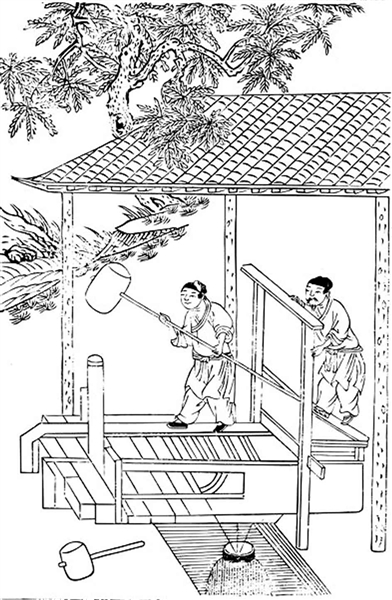 元朝农学家王祯写过一部《农书》,书中记载的榨油工艺就来自宋朝,并且附有一首题为《油榨》的五言诗,前四句是这么写的:“巨材成榨床,细溜刻槃口。麻烂入重圈,机械应心手。”翻成白话文就是说,用粗大的木料加工油榨,留出一道细细的出油口,将芝麻炒熟磨碎,用双层的模具制成饼坯(宋朝人将模具称为“圈”,将双层模具称为“重圈”),放进油榨,榨取出油。