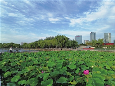 7月10日清早,在汾河景区跻汾桥下,竞相开放的荷花与蓝天、白云、绿树构成一幅优美的画卷,吸引市民驻足观赏、陶醉其间。 周利芳 高劲鹏 摄
