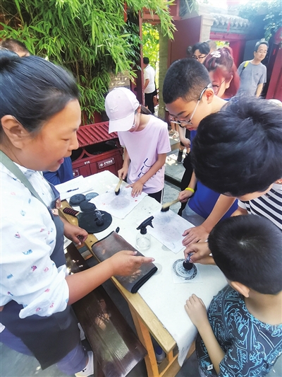 暑假来临,太山景区开展了丰富多彩的文化活动。7月9日,在太山龙泉寺内,一群小游客围在瓦当拓印台前,免费体验拓印技艺,感受其独特的文化魅力。 李晓琳 摄