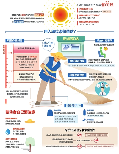 北京导游带团时中暑去世一事日前公布细节,再次引发舆论关注。连日高温,外卖员、环卫工人、建筑工人等户外劳动者仍奔忙在城市中,依据《防暑降温措施管理办法》,用人单位应采取哪些措施保障高温天气作业安全?劳动者自己还应采取哪些防护措施?