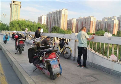拍摄经过:7月11日上午,长风桥北侧,钓鱼者将摩托车和电动车随意停在便道上十分影响通行,而且横在便道上的鱼竿也存在安全隐患,希望相关部门加强监管,整治这种不文明行为。
