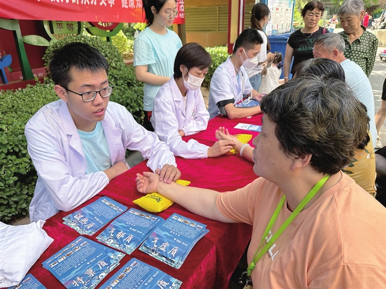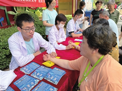 实践期间,10人的大学生志愿者团队,协助国医堂医生,为辖区居民群众把脉问诊,仔细询问他们的身体状况、既往病史,针对每位患者的不同情况,耐心地给予健康生活以及合理用药方面的指导,并为群众发放中医药健康教育、慢性病防治等手册,科普宣传中医药养生知识。