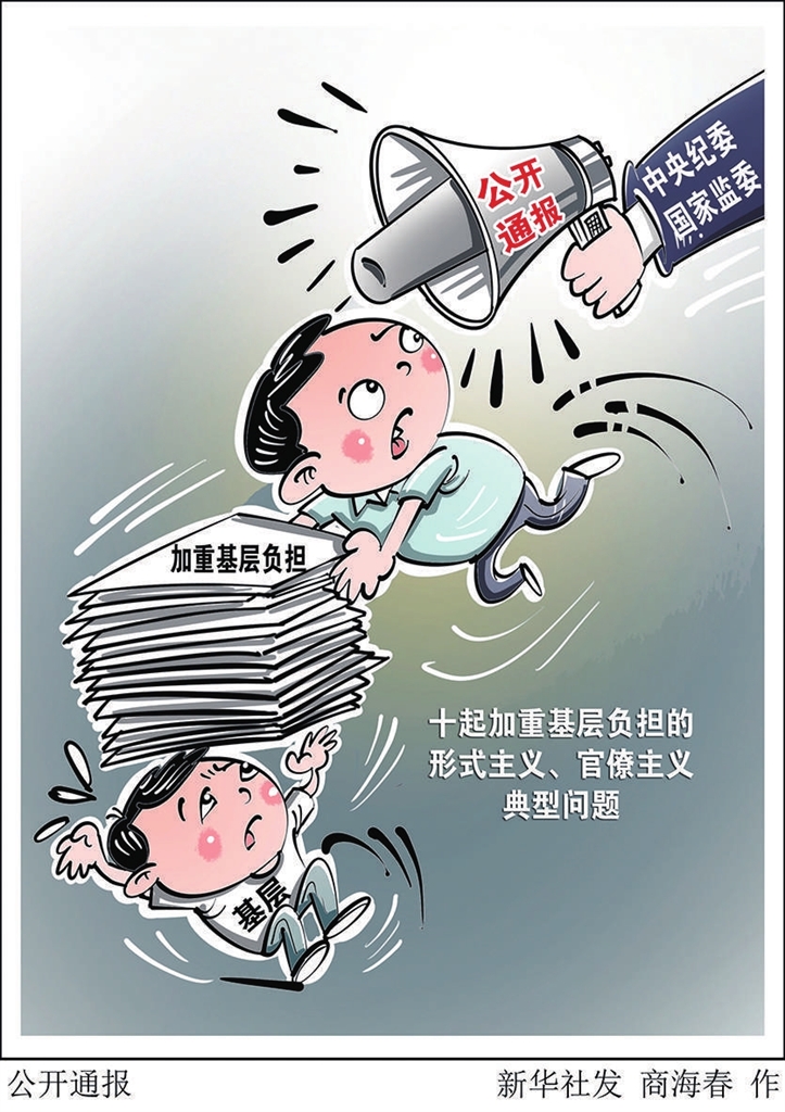 中央纪委国家监委强调,纠治加重基层负担的形式主义、官僚主义,要保持坚毅勇气、坚决态度,严抓不放、常抓不懈、动真碰硬。各级纪检监察机关要敢于亮剑,紧盯加重基层负担的老问题、新情况,健全发现问题机制,对苗头倾向问题早提醒、早纠正,对违规违纪行为严肃处理,对典型案例及时通报曝光,形成有力震慑。要健全制度机制,针对形式主义、官僚主义定性难、查处难的问题,着力加强案例指导,完善细化惩戒制度。推动各地区各部门在制定政策、部署任务、督促落实、考核检查等方面完善防止形式主义、官僚主义的机制,形成更加清晰的制度导向。要突出纠树并举,加强对各级领导干部的教育引导,推动对标党风要求找差距、对表党性要求查根源、对照党纪要求明举措,守牢思想防线、行为红线,大力发扬真抓实干、担当作为的时代新风,切实为基层减负、为干部鼓劲。