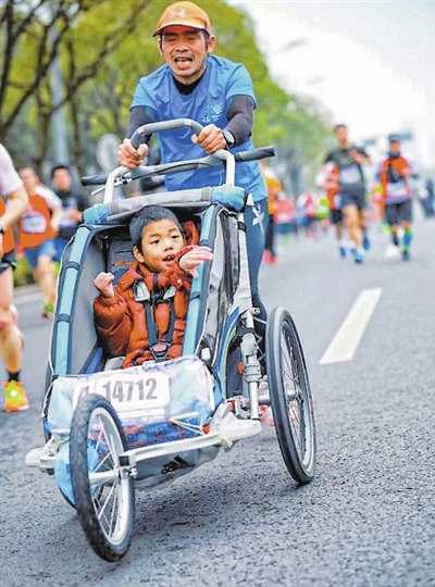 2015年11月1日,父子俩的第一跑算不上顺利。杭州迷你马拉松赛场上,天下着小雨,推着孩子的罗书坚跑起来还不适应,7公里的赛程跑了一个多小时。