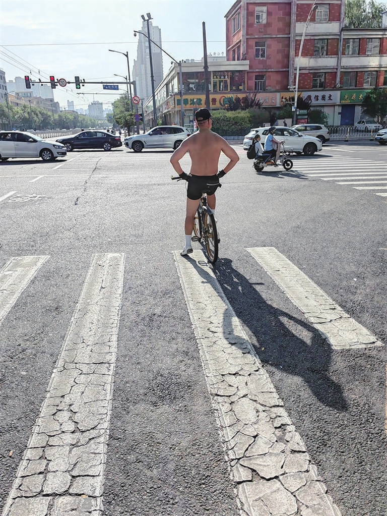 这是在北大街新建路交叉口拍到的,一位市民赤裸着上身在等候通行。
