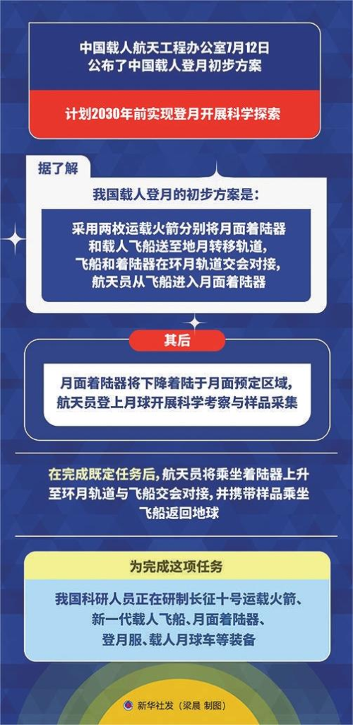 新华社武汉7月12日电(记者李国利)中国载人航天工程办公室12日公布了中国载人登月初步方案,计划2030年前实现登月开展科学探索。
