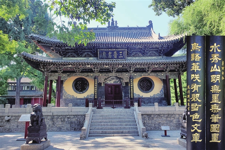 圣母殿是全祠的主殿,殿内供奉的是西周时周武王的妻子、周成王和唐叔虞的母亲、姜子牙的女儿——邑姜。大殿创建于北宋太平兴国九年(984)。殿周围廊,是我国现存古建筑中“副阶周匝”的最早实例。前廊中的八根木雕盘龙也是我国现存最早的。大殿采用了宋《营造法式》的“柱升起”“柱侧角”,增强了大殿的曲线美和稳固性。因此,圣母殿是我国宋代建筑的代表作,是研究我国古代建筑艺术和建筑发展的重要的实物资料。上联“悬瓮山高,碧玉一湾分晋水”,描绘了晋祠的自然风光。悬瓮山高耸入云,环抱晋祠。晋水清如碧玉,涓涓流淌。一弯清泉从悬瓮山流出,源前十孔出水,分为南北两渠,分流而走。晋水孕育了晋祠的山,晋祠的田,晋祠的百姓,晋祠的文化。下联“剪桐泽远,慈云千古荫唐村”,讲述了晋祠的历史传说。千年的“剪桐封弟”,成就了唐叔虞,成就了唐村,成就了晋祠。