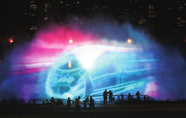 7月14日,夜幕降临,长风商务区水幕电影精彩上演,人们尽享惬意生活。随着我市不断推进各类休闲场所的建设,让市民消夏有了更多的选择。 邓寅明 摄