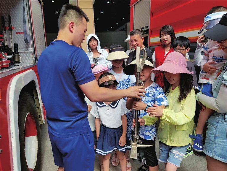活动中,消防员带领孩子们近距离接触消防车,用简单通俗的语言向小朋友们介绍了消防车上的储水罐、高压水枪、云梯等器械,让他们对消防车有了更加直观的了解。消防站工作人员还给孩子们科普了各类消防设施和装备器材,教授大家火灾预防、逃生自救等安全常识,引导他们正确认识火灾危害并学习如何预防和应对火灾。